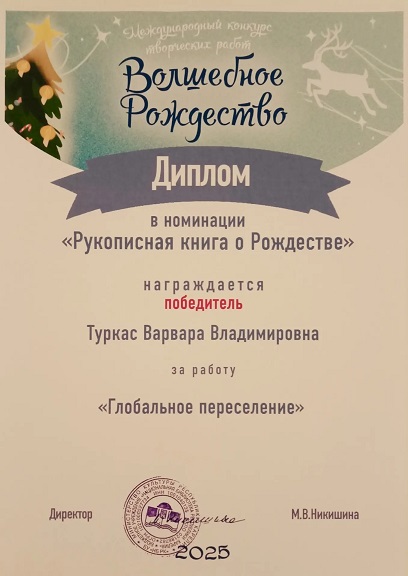 Ее книга «Глобальное переселение» заняла призовое место в номинации «Рукописная книга о Рождестве» среди детей 7-12 лет